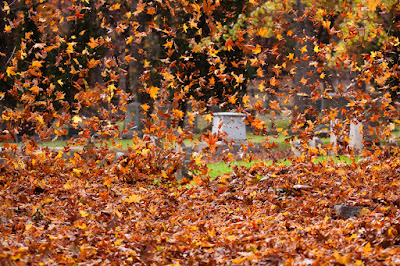 After awhile the sun disappeared and the leaves were all to the road. I put the camera away and started walking to the car, feeling pretty good about the opportunity I just had. As I walked by a mausoleum there was a work crew putting on a new roof. I paused just long enough to hear what song was playing on their radio. and 'Let It Be' by the Beatles was just finishing up.